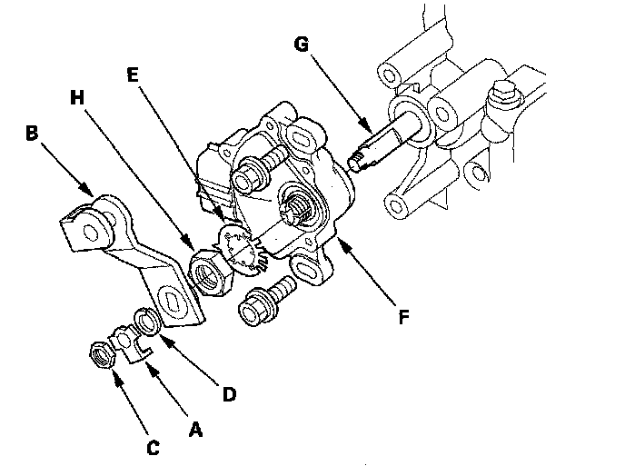 10. Pry the lock tabs of the lock washer (E) on the transmission range switch (F), hold the selector control shaft (G) with a 6.0 mm wrench, and loosen the locknut (H).