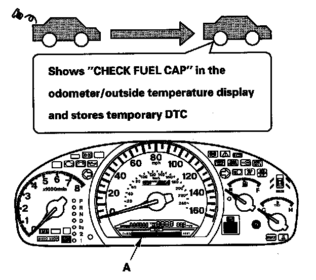 During the first drive cycle after a cold start, the PCM alerts the driver to check the fuel fill cap by showing a "CHECK FUEL CAP" message in the odometer/outside temperature display (A), and it stores Temporary DTC P0457 "Evaporative Emission (EVAP) System Leak Detected/Fuel Fill Cap Loose or Missing." Tightening the fuel cap does not make the message go off immediately.