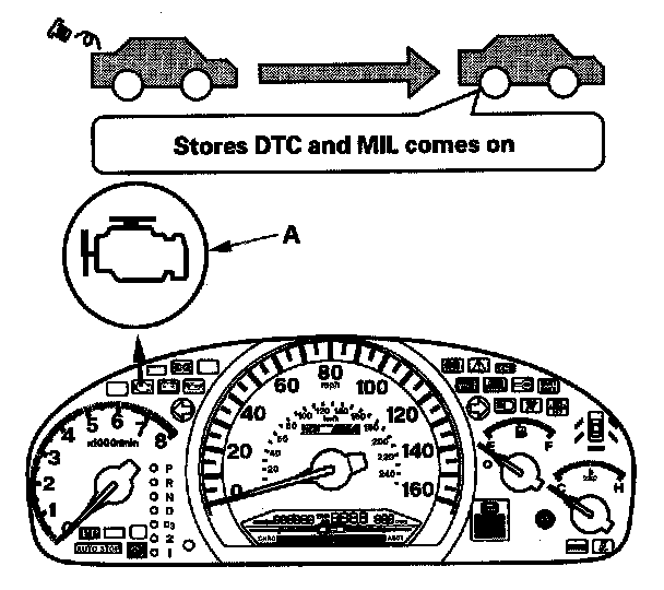 During the third drive cycle after a cold start, if the fuel fill cap is still loose or missing, the PCM stores DTC P0457 "Evaporative Emission (EVAP) System Leak Detected/Fuel Fill Cap Loose or Missing". The malfunction indicator lamp (MIL) (A) comes on, and the "CHECK FUEL CAP" message goes off.