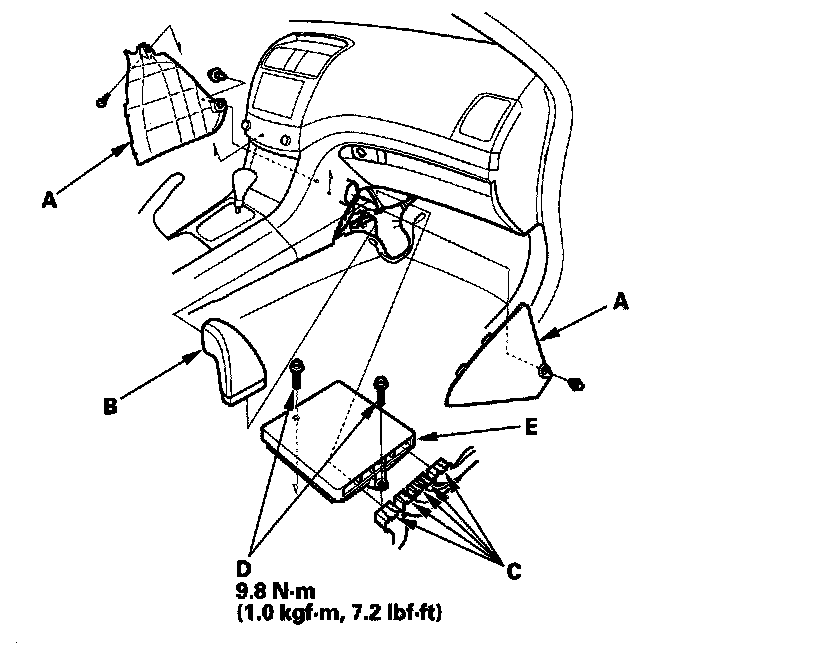 11. Remove the bolts (D), then remove the PCM (E).