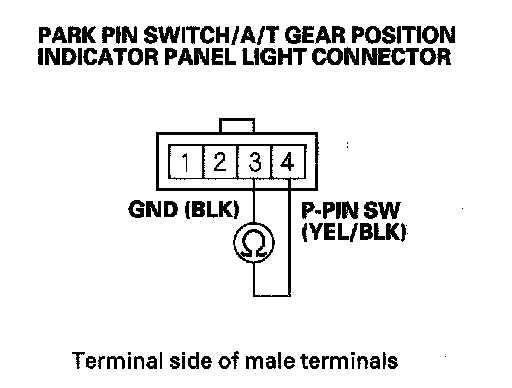 9. Check for continuity between park pin switch/A/T gear position indicator panel light connector terminals No. 3 and No. 4 while the shift lever is in the P position, and when the shift lever is out of the P position.