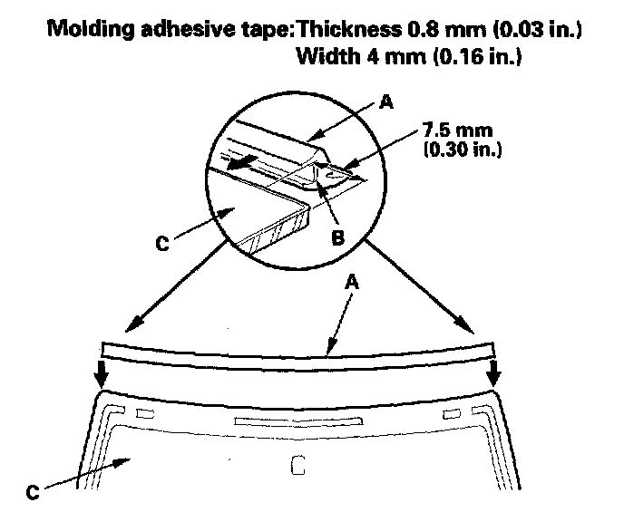 12. Attach the molding (A) with adhesive tape (B) to the upper edge of the windshield (C). Be careful not to touch the windshield where adhesive will be applied.