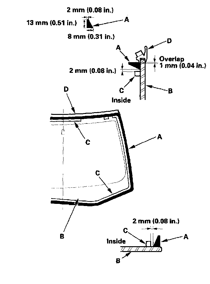 19. Pack adhesive into the cartridge without air pockets to ensure continuous delivery. Put the cartridge in a caulking gun, and run a bead of adhesive (A) around the edge of the windshield (B) between the dams (C) and molding (D) as shown. Apply the adhesive within 30 minutes after applying the glass primer. Make a slightly thicker bead at each corner.