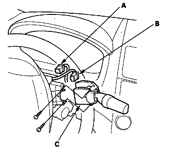 3. Disconnect the combination light switch 12P connector (A) and dashboard wire harness 8P connector (B) from the wiper/washer switch (C).