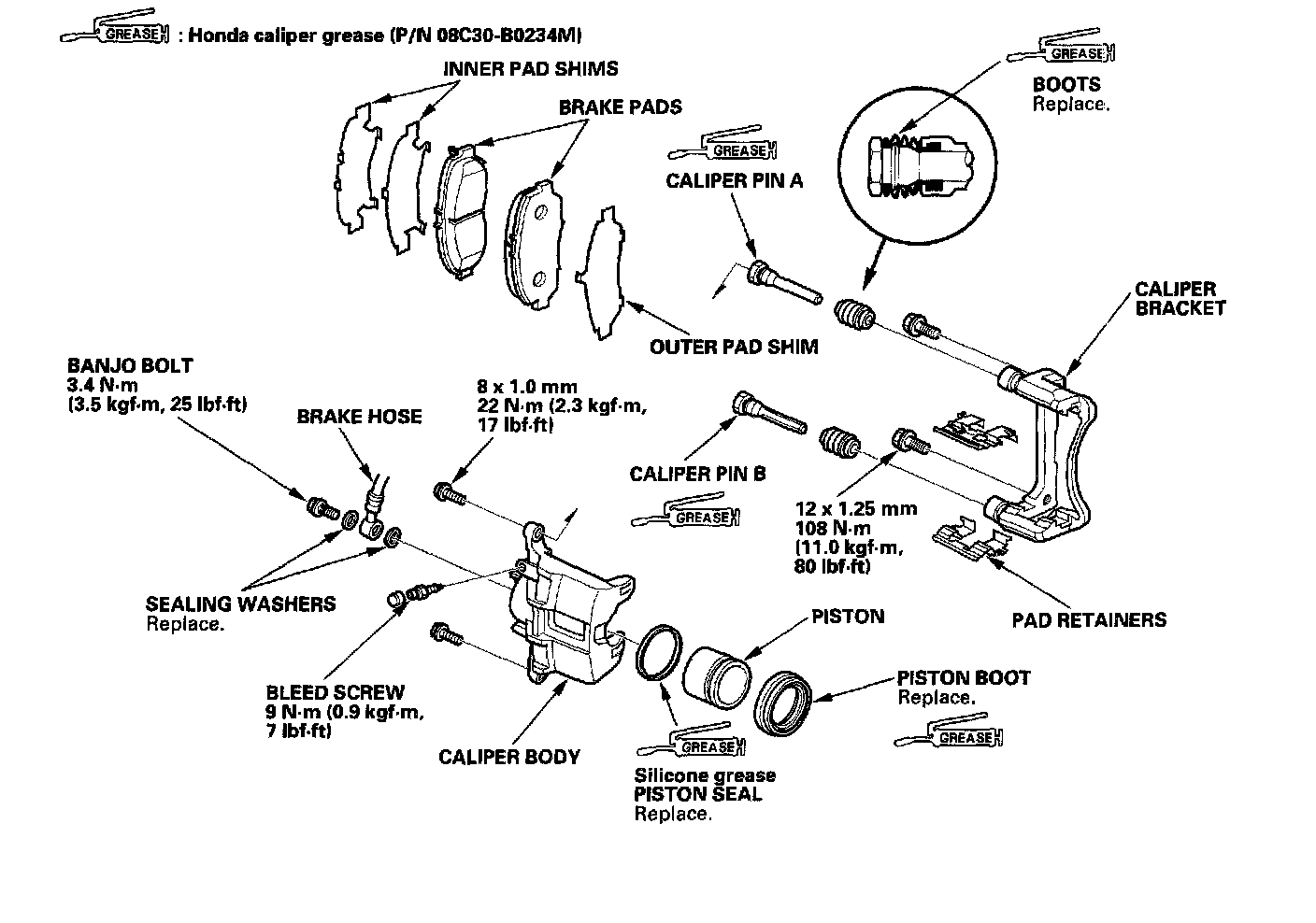 Remove, disassemble, inspect, reassemble, and install the caliper, and note these items: