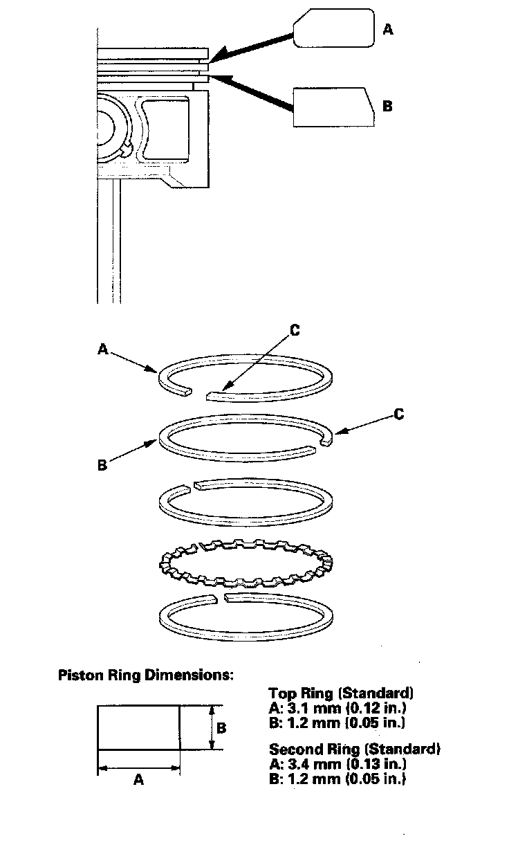 ^ If the gap is too large, recheck the cylinder bore diameter against the wear limits. If the bore is over the service limit, the engine block must be rebored.