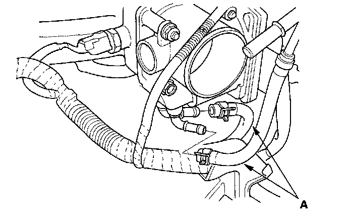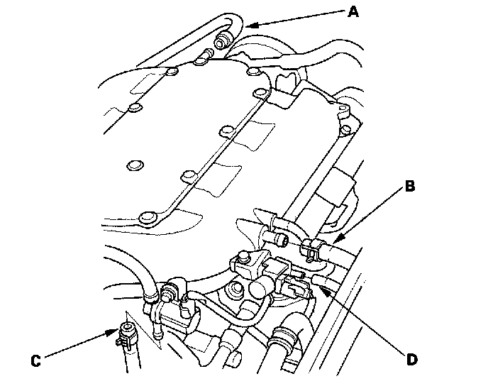6. Install the positive crankcase ventilation (PCV) hose (A), brake booster vacuum hose (B), evaporative emission (EVAP) canister hose (C), and vacuum hose (D).