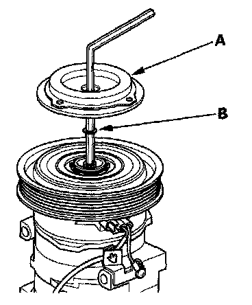 1. Remove the center bolt (A) while holding the pressure plate with a commercially available A/C clutch holder (B).