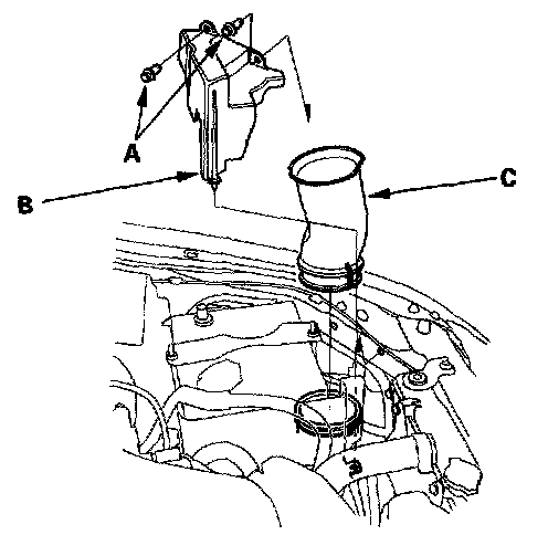 5. Remove the clips (A), then remove the air intake cover (B) and the air intake tube or duct (C).