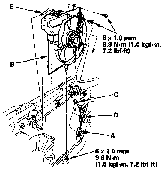 6. Remove the A/C compressor clutch connector (A) from the A/C condenser fan shroud (B). Disconnect the A/C condenser fan connector (C), then remove the wire harness clip (D) from the A/C condenser fan shroud. Remove the hose (E) from the radiator. Loosen the lower mounting bolt, then remove the upper mounting bolts and the A/C condenser fan shroud. Be careful not to damage the radiator fins when removing the A/C condenser fan shroud.