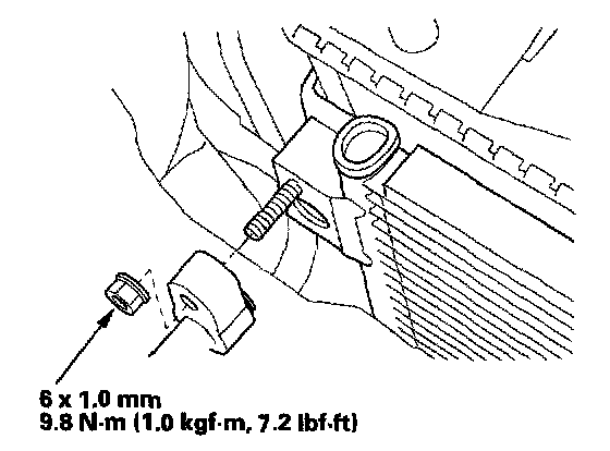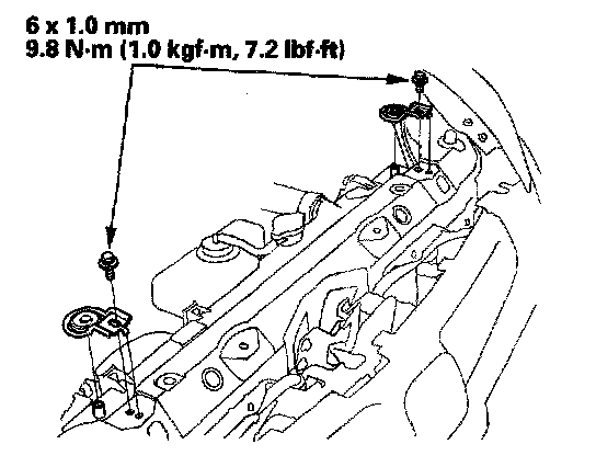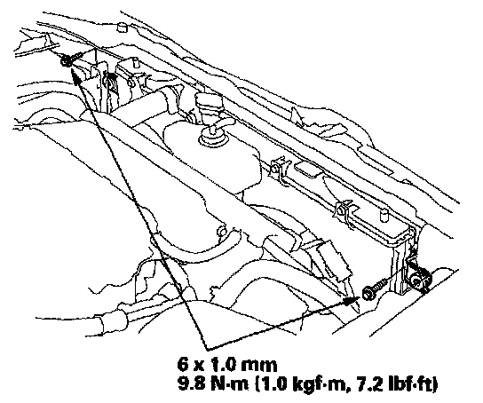 7. Remove the bolts and the radiator upper mount brackets.