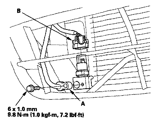 8. Remove the bolt, then disconnect the receiver line (A) from the A/C condenser. Disconnect the A/C pressure switch connector (B).