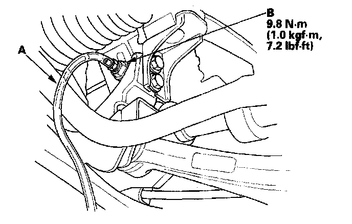 4. Install a rubber hose (A) on the drain bolt (B) located at the rear of the cylinder block, then loosen the drain bolt.