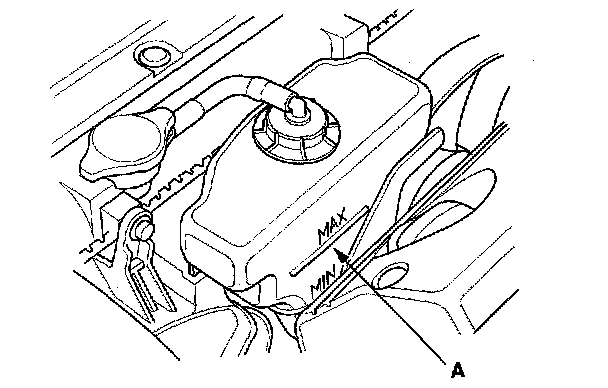 8. Fill the reserve tank to the MAX mark (A) with Honda Long Life Antifreeze/Coolant Type 2 (P/N OL999-9001).