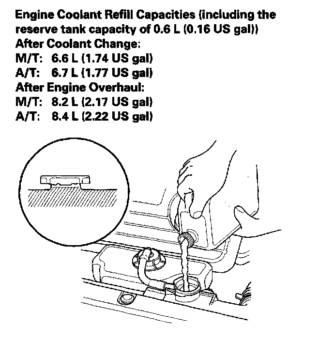 9. Pour Honda Long Life Antifreeze/Coolant Type 2 into the radiator up to the base of the filler neck.