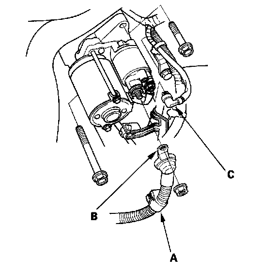 5. Disconnect the starter cable (B) from the B terminal, then disconnect the BLK/WHT wire (C) from the S terminal.