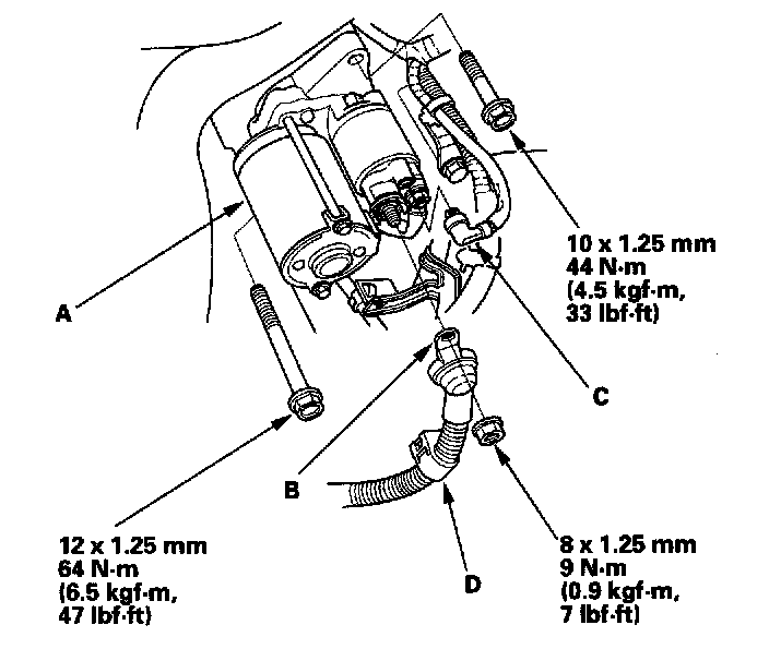1. Install the starter (A). Make sure the crimped side of the ring terminal faces away from the starter when you connect it.