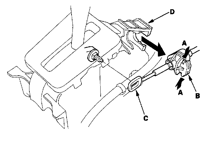 5. Press the holder lock release (A), and pull out the socket holder (B) on the shift cable (C) of the shift lever bracket base (D).