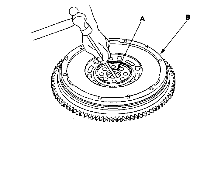 3. Measure the flywheel (A) runout using a dial indicator (B) through at least two full turns with the engine installed. Push against the flywheel each time you turn it to take up the crankshaft thrust washer clearance. If the runout is not within the standard, replace the flywheel, and recheck the runout. Resurfacing the flywheel is not recommended.
