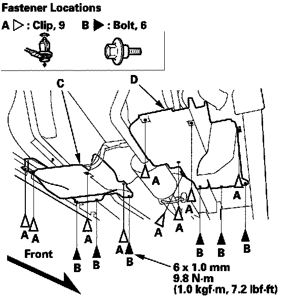 1. Remove the clips (A) and bolts (B), then remove the left middle under-floor cover (C) and right middle under-floor cover (D).