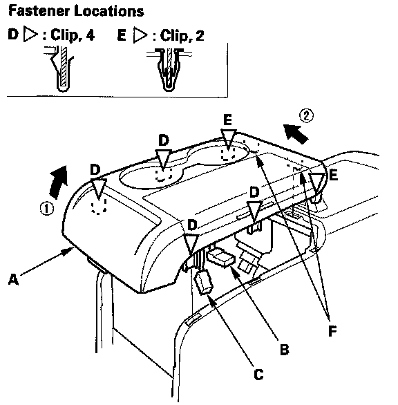 3. Pull the rear portion of the center console upper panel up, remove the clips (E), and release the hooks (F).