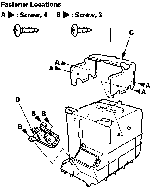 4. Remove the screws, then remove the cup holder (A). Detach the harness clips (B), and remove the console subharness (C) from the cup holder.