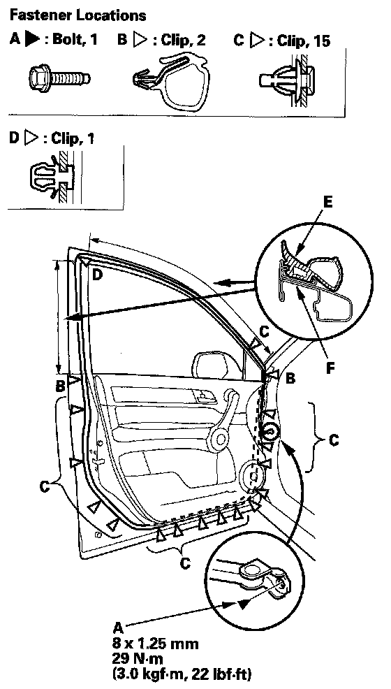 2. Detach the clips (B, C, D), then remove the door weatherstrip (E).
