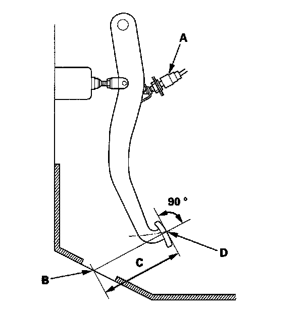 2. Pull back the carpet and find the cutout (B) in the insulator. Lift up the insulator-cutout and measure the pedal height (C) at the middle of the left side center of the pedal pad (D) to the floor.