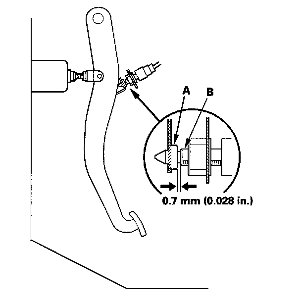 4. Lift up on the brake pedal by hand. Push in the brake pedal position switch until its plunger is fully pressed (threaded end (A) touching the pad (B) on the pedal arm). Then, turn the switch 45° clockwise to lock it. The gap between the brake pedal position switch and the pad is automatically adjusted to 0.7 mm (0.028 in.) by locking the switch. Make sure the brake lights go off when the pedal is released.