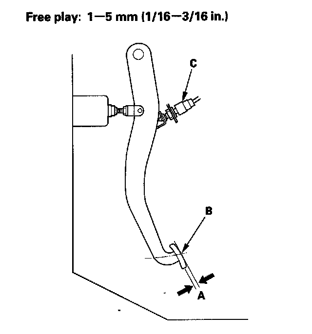 1. With the engine off, inspect the pedal free play (A) on the pedal pad (B) by pushing the pedal by hand. If the brake pedal free play is insufficient, it may result in brake drag. Check for a misadjusted the brake pedal position switch (C).