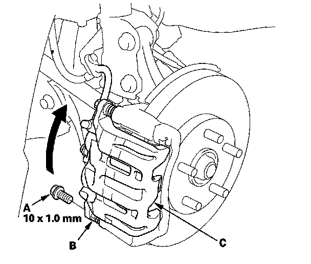 4. Remove the flange bolt (A) while holding the caliper pin (B) with a wrench. Be careful not to damage the pin boot, and pivot the caliper (C) up out of the way. Check the hose and pin boots for damage and deterioration.