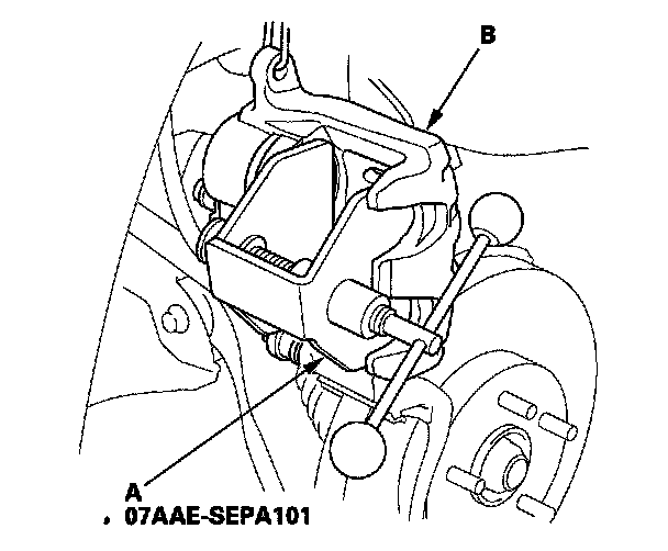 7. Clean the caliper bracket (B) thoroughly; remove any rust, and check for grooves and cracks.