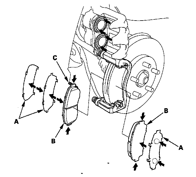15. Install the brake pads and pad shims correctly. Install the brake pad with the wear indicator (C) on the upper inside. If you are reusing the brake pads, always reinstall the brake pads in their original positions to prevent a temporary loss of braking efficiency.
