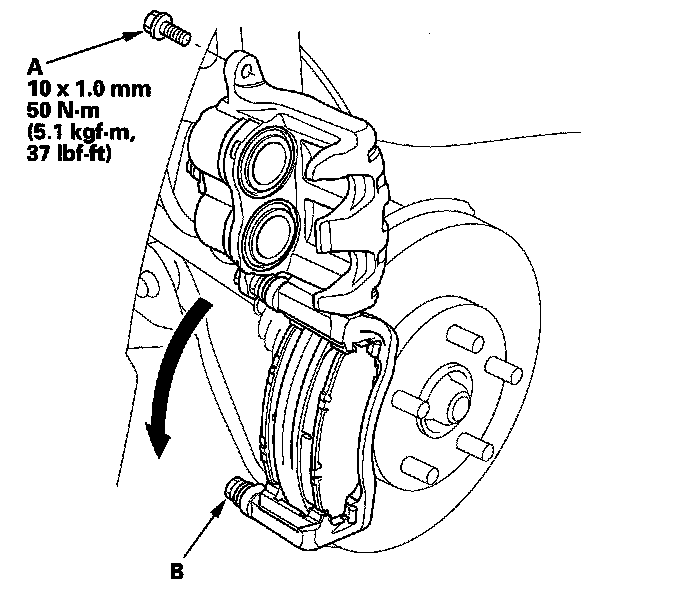 16. Pivot the caliper down into position. Install the flange bolt (A), and tighten it to the specified torque while holding the caliper pin (B) with a wrench. Be careful not to damage the pin boot.