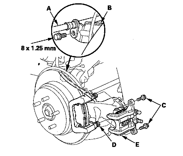 5. Remove the flange bolts (C) while holding the caliper pin (D) with a wrench. Be careful not to damage the pin boot, and remove the caliper (E). Check the hose and pin boots for damage and deterioration.