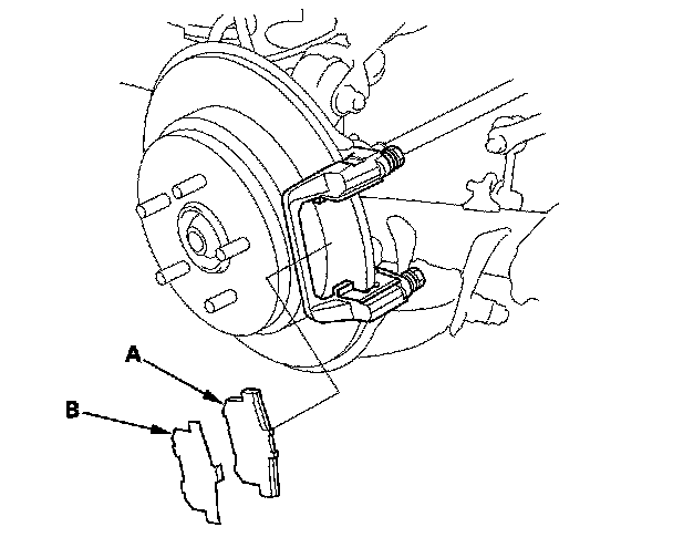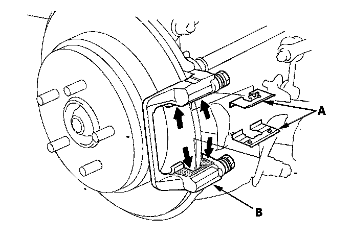 6. Remove the outer pad (A) and the pad shim (B).