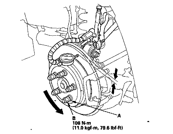 5. Install suitable flat washers (A) and wheel nuts (B), and tighten the wheel nuts to the specified torque to hold the brake disc/drum securely against the hub.