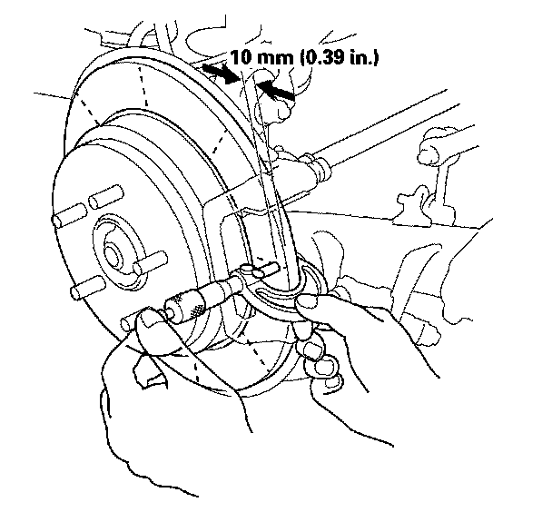 4. Using a micrometer, measure the brake disc/drum thickness at eight points, about 45° apart and 10 mm (3/8 in.) in from the outer edge of the brake disc/drum. Replace the brake disc/drum if the smallest measurement is less than the maximum refinishing limit.