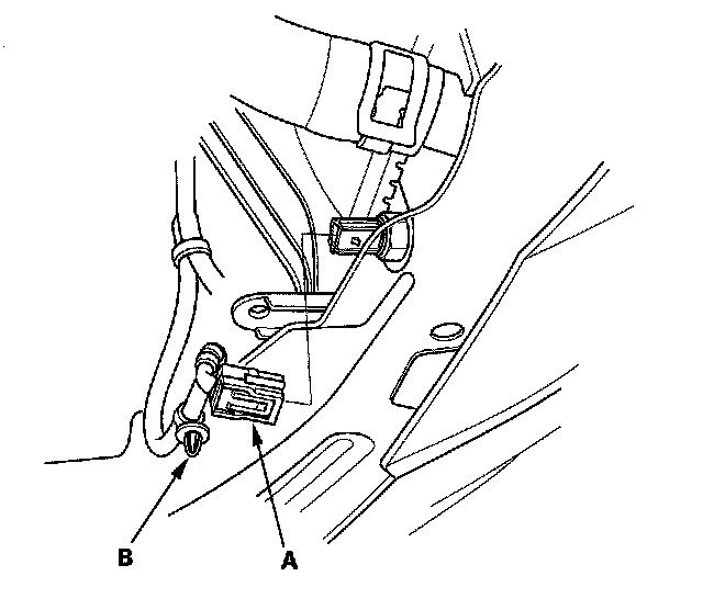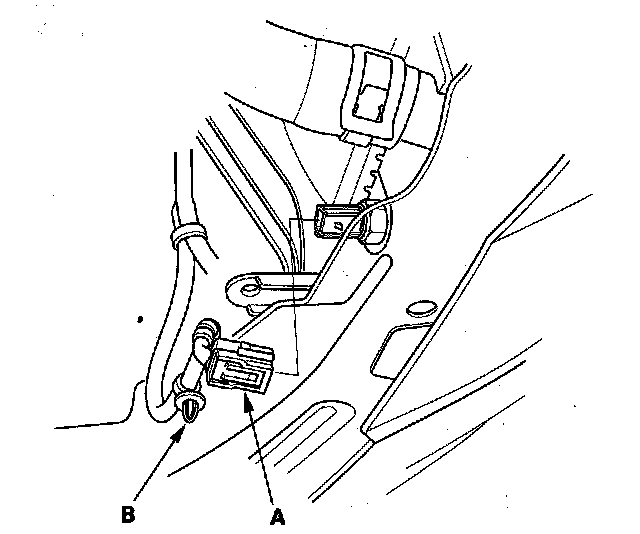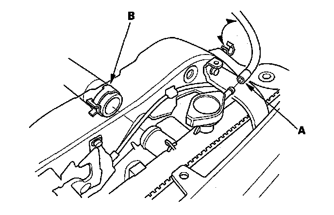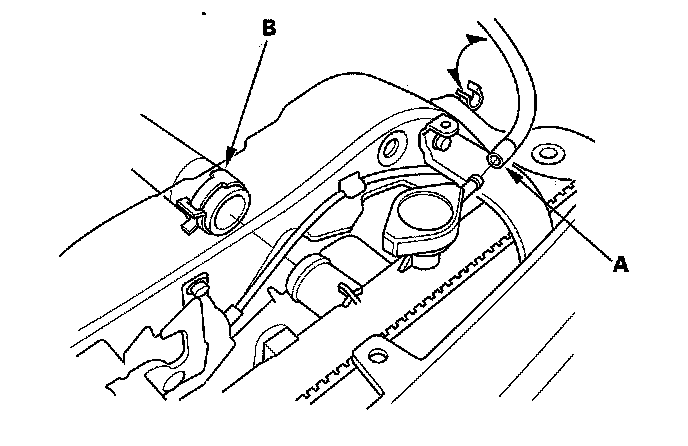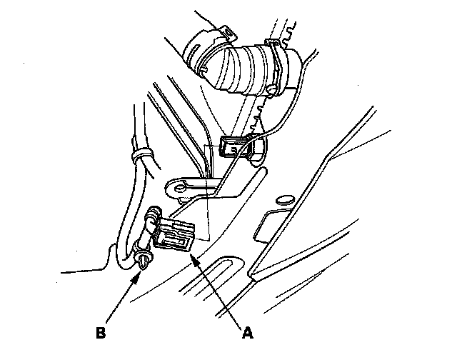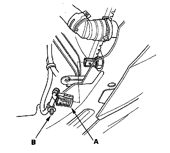 7. Disconnect the engine coolant temperature (ECT) sensor 2 connector (A), and remove the harness clamp (B).