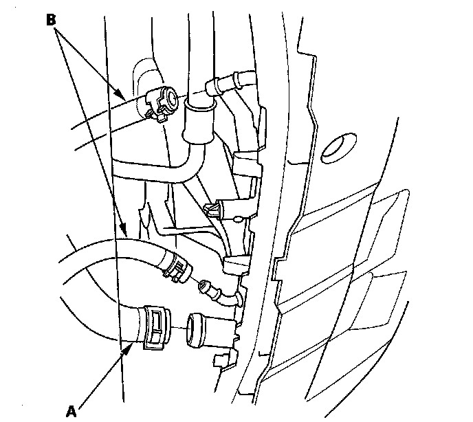 9. Remove the automatic transmission fluid (ATF) cooler hoses (B), then plug the hose and line.