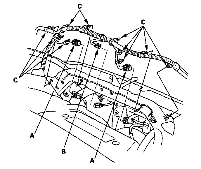 12. Disconnect the fan motor connectors (A) and hood switch connector (B), then remove the harness clips (C).