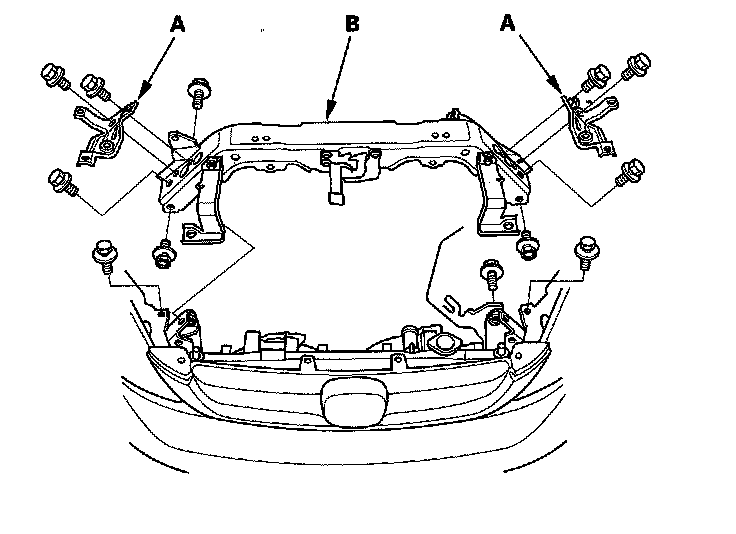13. Remove the radiator upper brackets (A), then remove the front bulkhead (B).