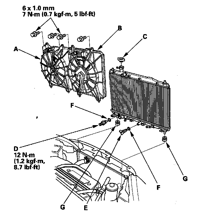 14. Reassemble the radiator with new O-rings (F).