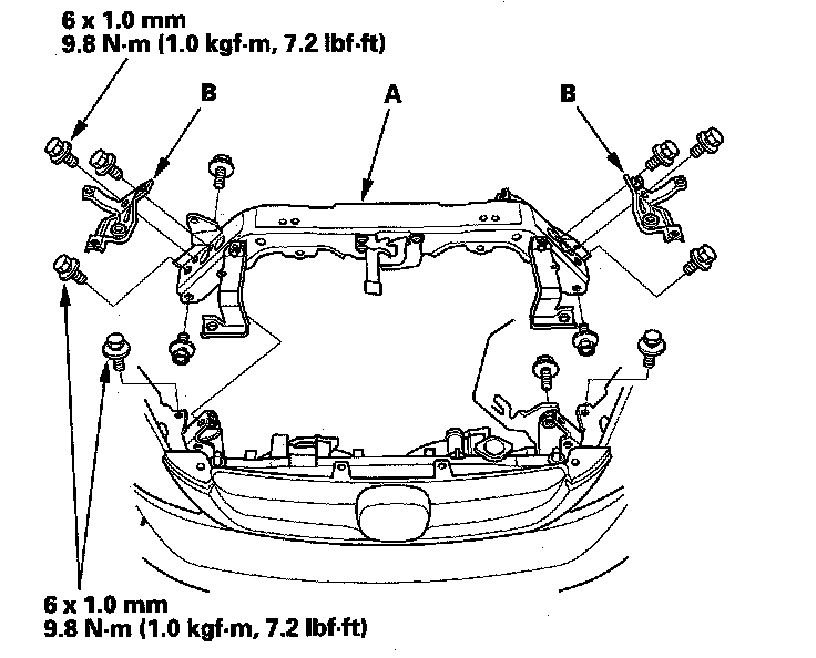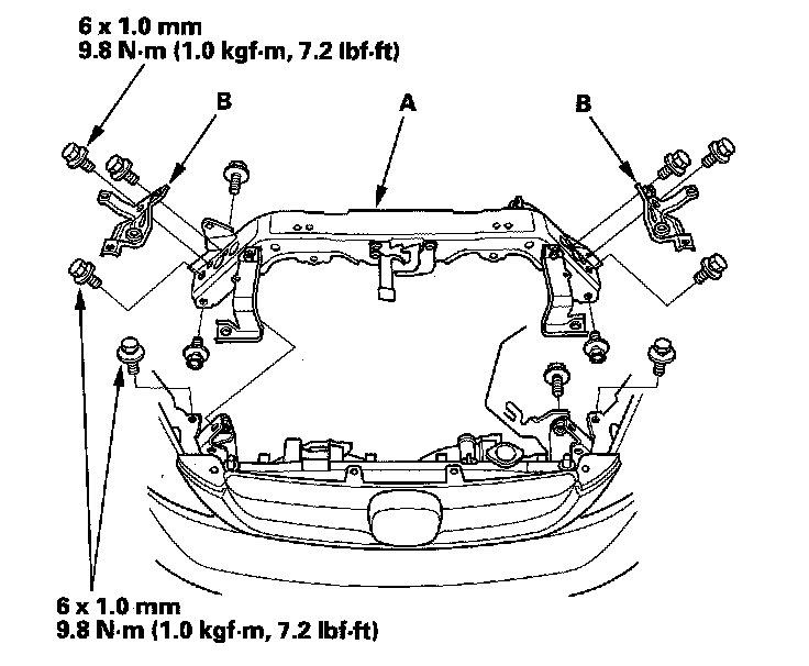 12. Remove the radiator upper brackets (A), then remove the front bulkhead (B).