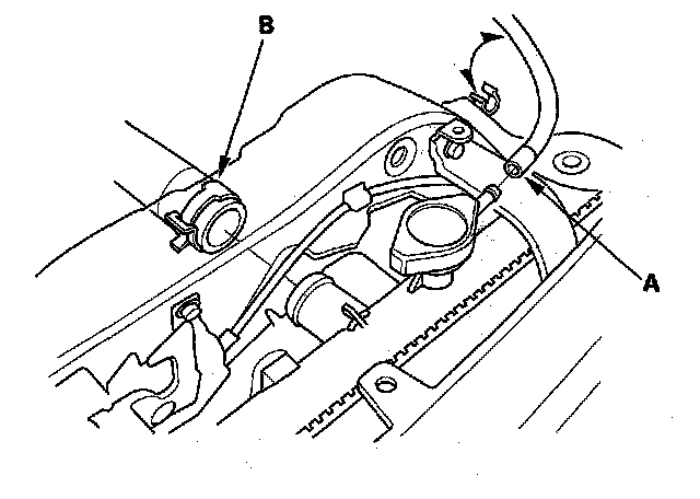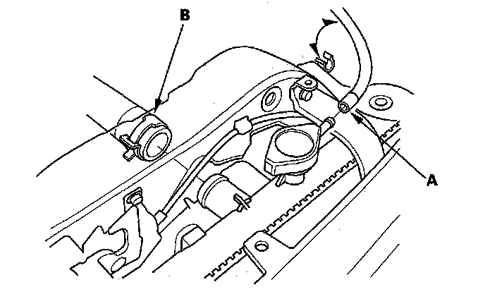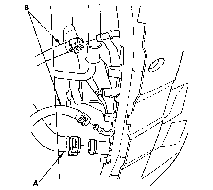 4. Remove the coolant reservoir hose (A) and upper radiator hose (B).