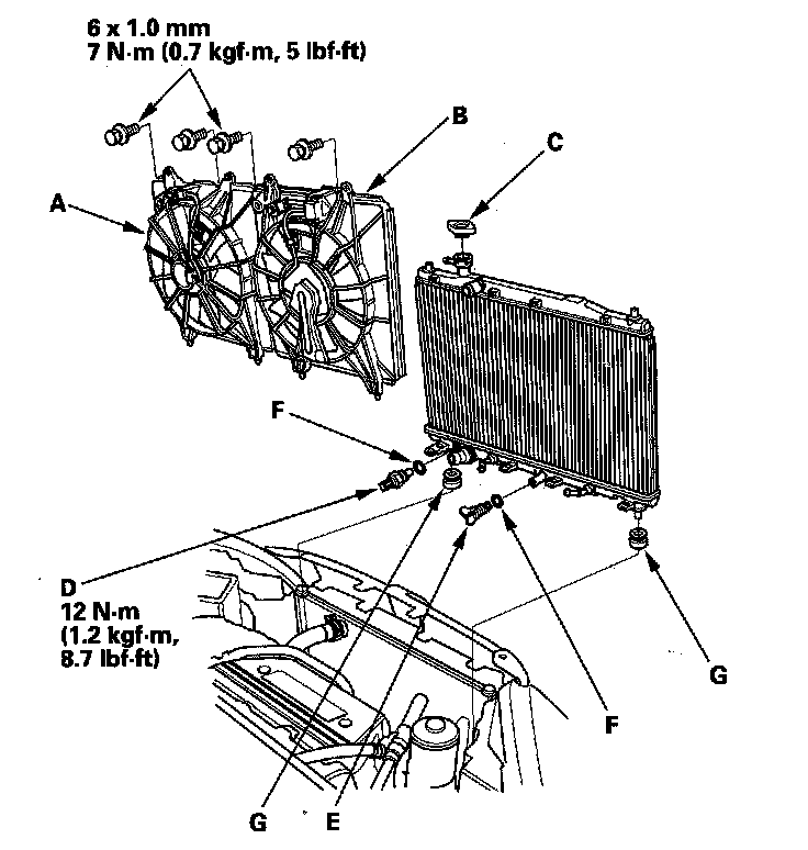 15. Reassemble the radiator with new O-rings (F)..