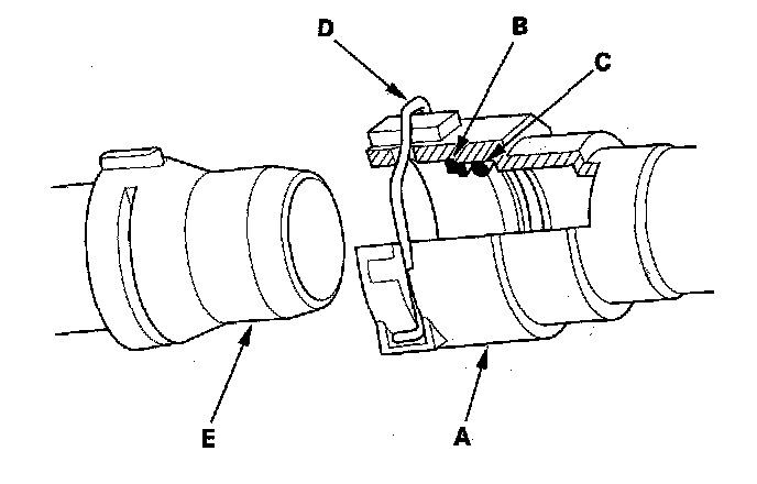 21. Check the quick connector (A) and set ring (B) for cracks or damage. If the connector and/or set ring are cracked or damaged, replace the connector.