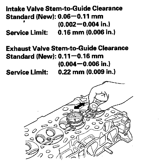 3. Subtract the O.D. of the valve stem, measured with a micrometer, from the I.D. of the valve guide, measured with an inside micrometer or ball gauge. Take the measurements in three places along the valve stem and three places inside the valve guide. The difference between the largest guide measurement and the smallest stem measurement should not exceed the service limit.