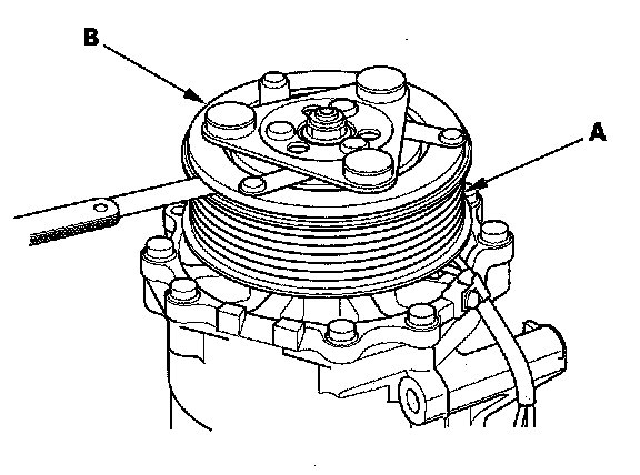 3. Measure the clearance between the rotor pulley (A) and the armature plate (B) all the way around. If the clearance is not within specified limits, remove the armature plate and add or remove shims as needed to increase or decrease clearance.