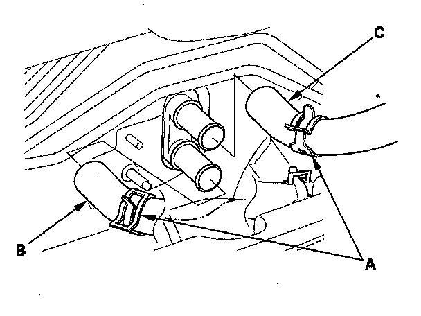 5. From under the hood, slide the hose clamps (A) back. Disconnect the inlet heater hose (B) and the outlet heater hose (C) from the heater unit. Note the orientation of the hose.